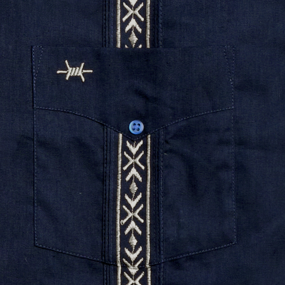 This men's Tejas Guayabera features silver embroidery on a navy blue base.
