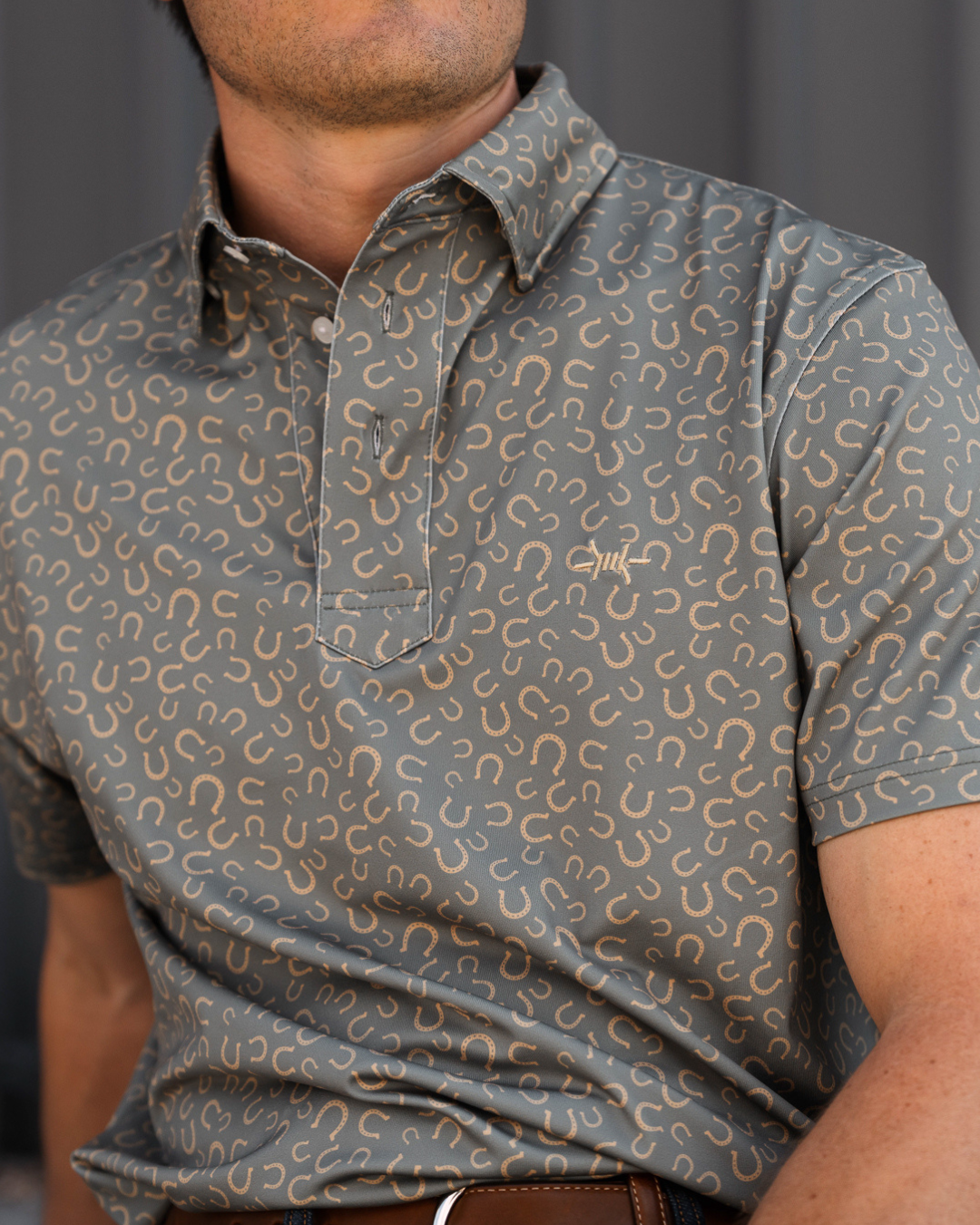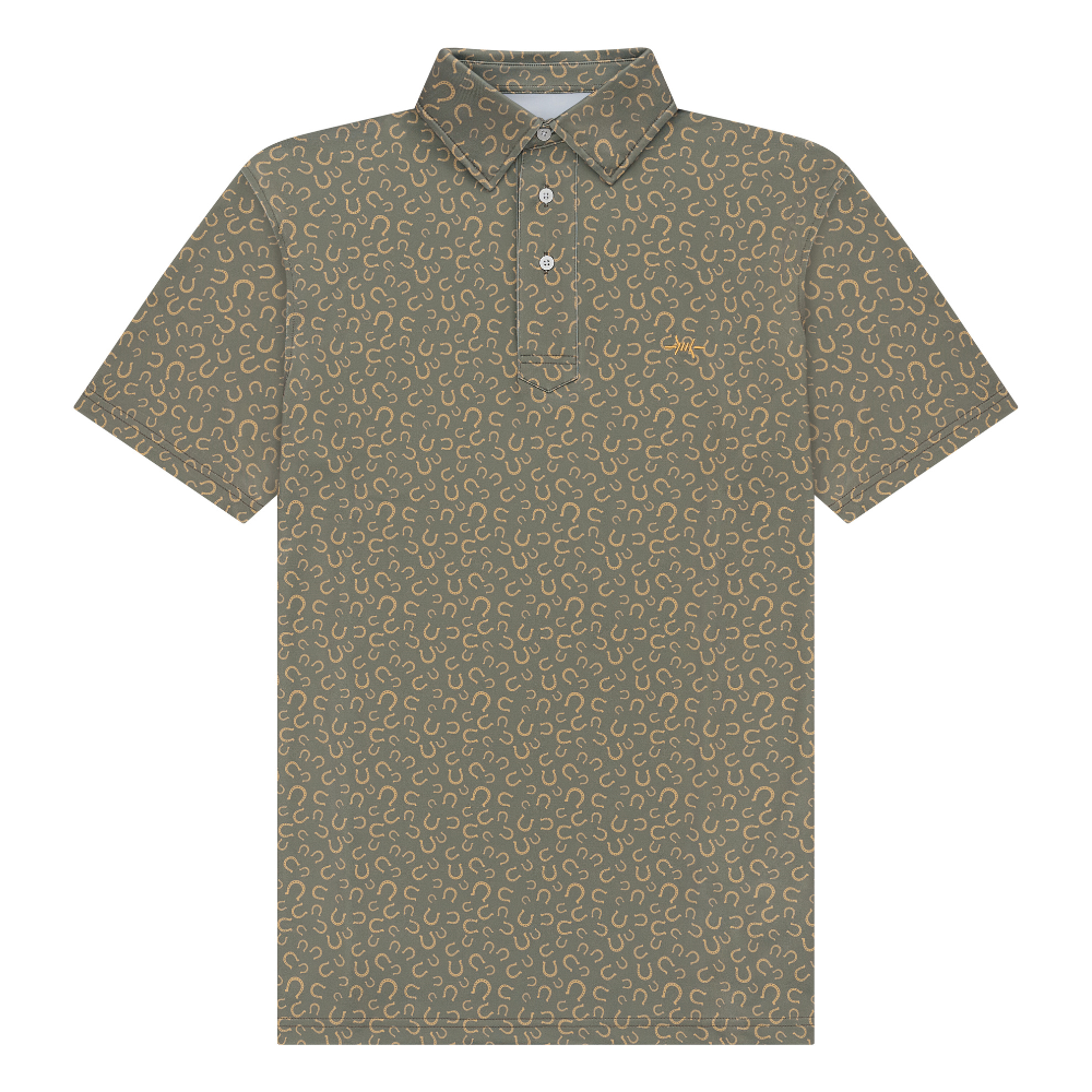 The Traditions Polo - Horseshoe puts a classic Western symbol front and center. Covered in a field of horseshoes and finished with a clean embroidered barbed-wire mark, this pattern balances tradition with a modern edge. It’s subtle enough for the office, sharp enough for a night out, and just bold enough to stand apart from the standard solid polo.